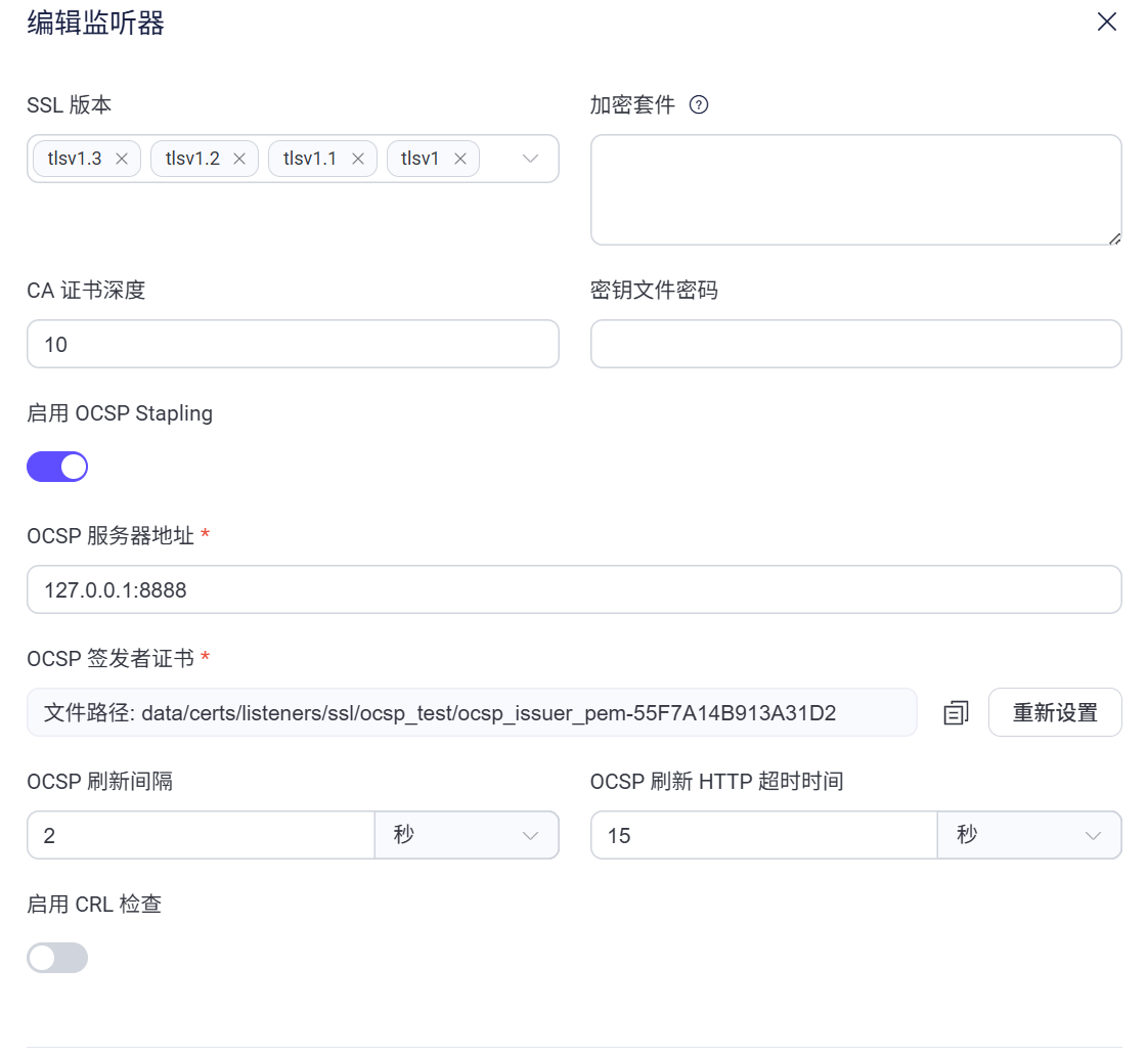 我在测试吊销证书时,通过Nginx作为OCSP Stapling连接OCSP 是能够吊销成功的,配置到EMQX时吊销失败。我的配置如下