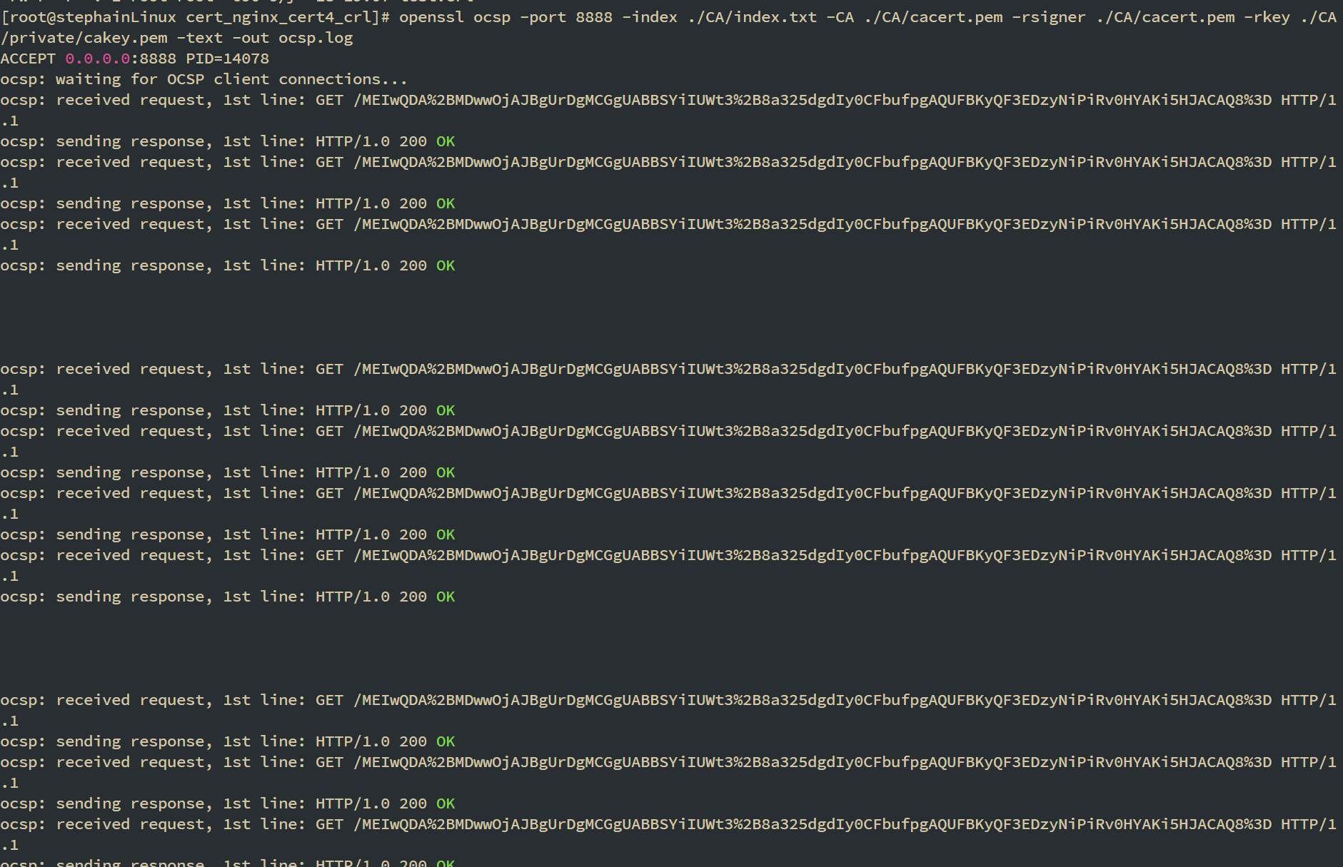 我的OCSP Server是最简单用于测试的openssl ocsp -port 8888建立的,其实看到有请求过来,但不知道为什么EMQX证书吊销不成功,相应的日志也没有看到