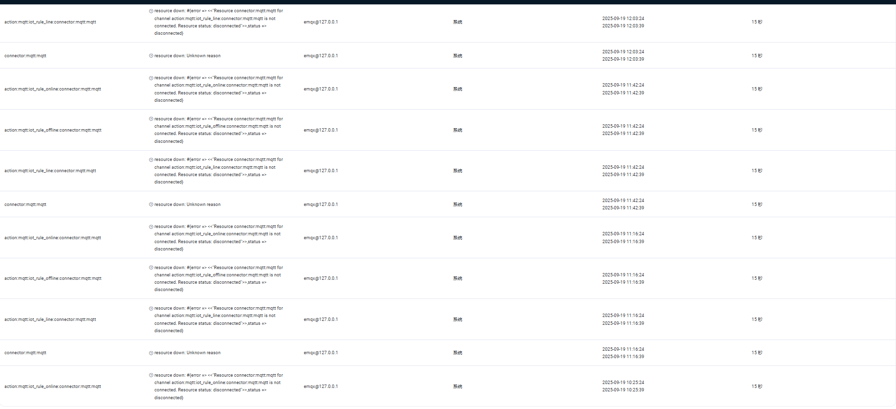 2025-09-22T17:21:50.948420+08:00 [warning] msg: alarm_is_activated, mfa: emqx_alarm:do_actions/3(418), message: <<“resource down: #{error => <<"Resource connector:mqtt:mqtt for channel action:mqtt:iot_rule_online:connector:mqtt:mqtt is not connected. Resource status: disconnected">>,status => disconnected}”>>, name: <<“action:mqtt:iot_rule_online:connector:mqtt:mqtt”>>