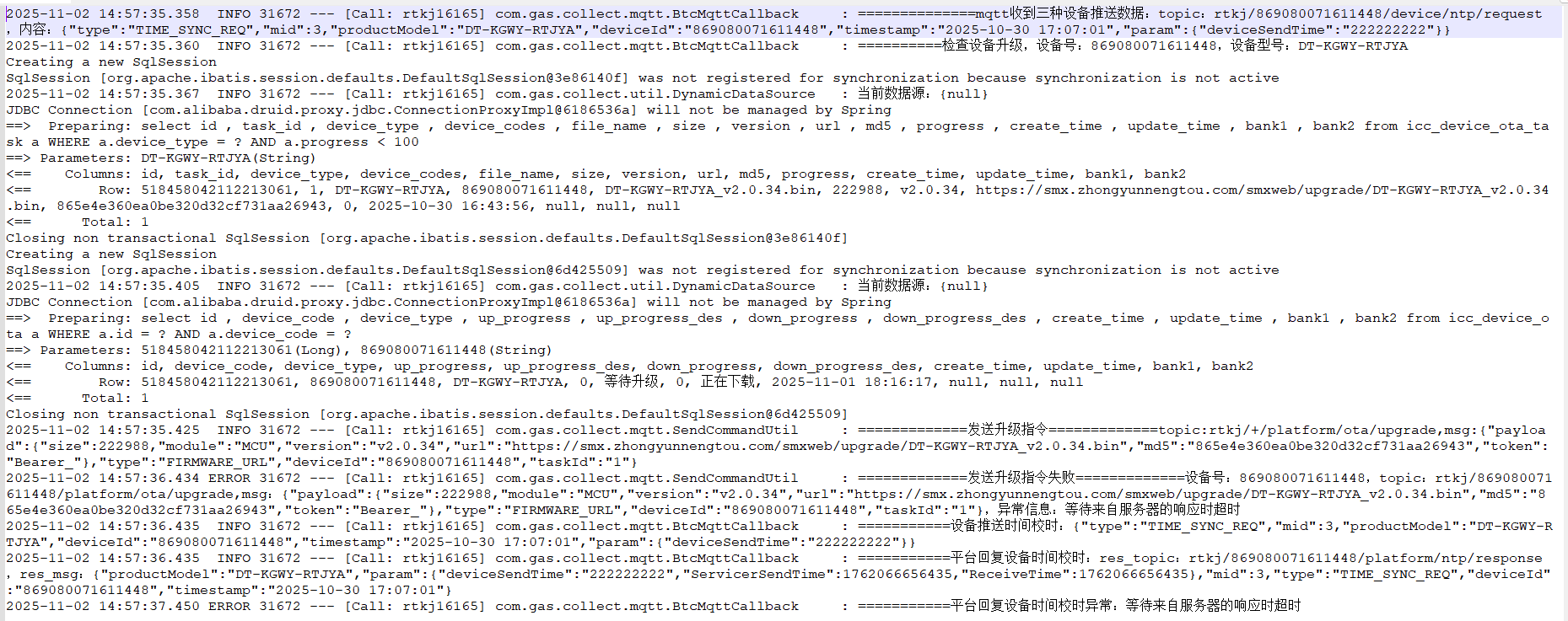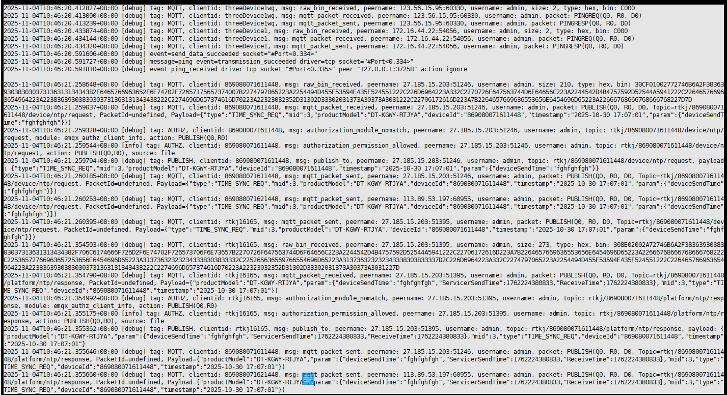 看debug日志没啥异常,但是服务日志就不行,有没有可能是emqx上的那些配置没设置好?我把两个日志都发给您,麻烦帮忙看看。
