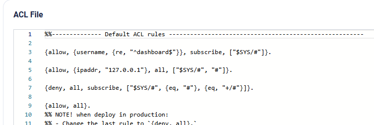 你可以看看 emqx 的 debug 日志。你第 9 行的 allow all,应该会允许所有的订阅才对。