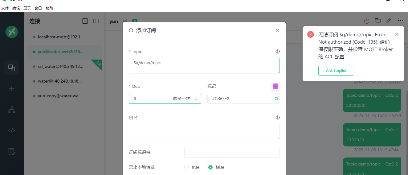并没有设置ACL,MQTTX提示无法订阅。使用代码订阅$q/{xxxx}无响应