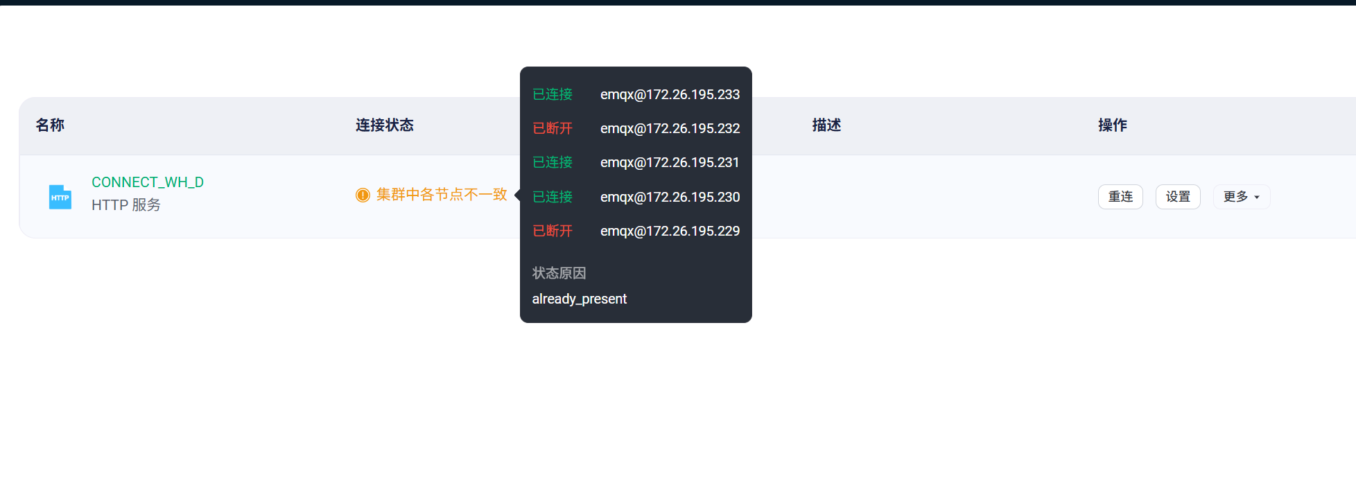 emqx版本5.8.6,我有5个节点,webhook连接器始终显示有几个连接不上,而且不同时间是随机的,我可以确定网络是通的,因为我在每个节点上试过都OK