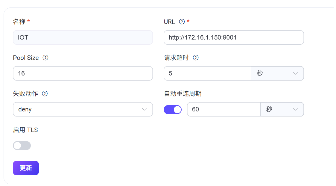 {“auto_reconnect”:“”,“enable”:false,“failed_action”:“deny”,“name”:“IOT”,“pool_size”:16,“request_timeout”:“5s”,“ssl”:{“ciphers”:,“depth”:10,“enable”:false,“hibernate_after”:“5s”,“log_level”:“notice”,“middlebox_comp_mode”:true,“reuse_sessions”:true,“secure_renegotiate”:true,“verify”:“verify_peer”,“versions”:[“tlsv1.3”,“tlsv1.2”]},“url”:“http://172.16.1.150:9001”}