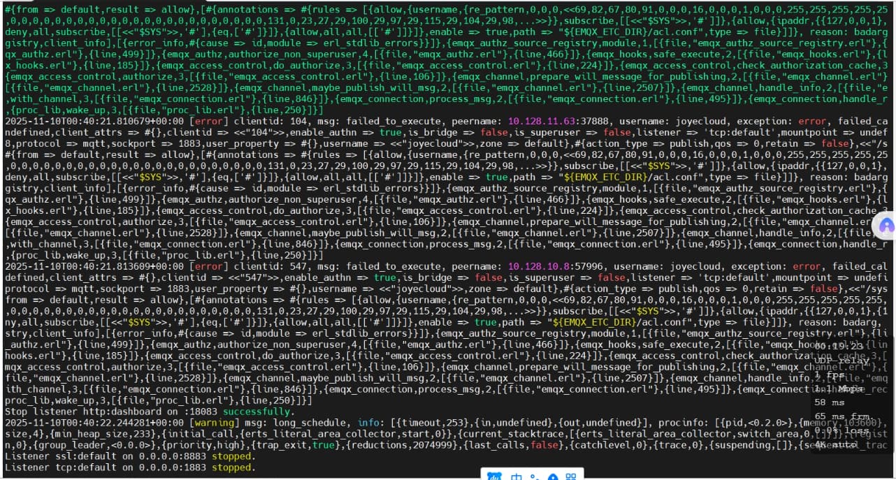authentication_failure 警告,涉及客户端用户名,排查后确认 MySQL 用户表数据及连接配置无误3.问题发生后平台下发的控制设备指令失效,重启emqx容器就会恢复正常,过一天早上7.30左右又会复现