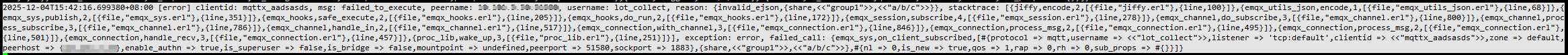 无法收到发送端推送到/a/b/c主题的数据,检查EMQX的日志发现,当MQTTX客户端连接的时候,出现错误日志,如下:
