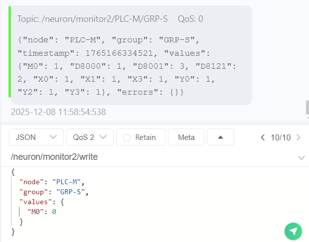 南向设备的几个点位设置了可以读写,数据监控界面更改该点位的数值,是成功的。 北向也设置好,MQTTX成功连接,设置的订阅会不断返回点位的实时数值,但如果提交写数值的json,却无法变更相应的南向点位数值。请问怎么一回事?帮看看哪里没设置好还是提交的JSON有问题。