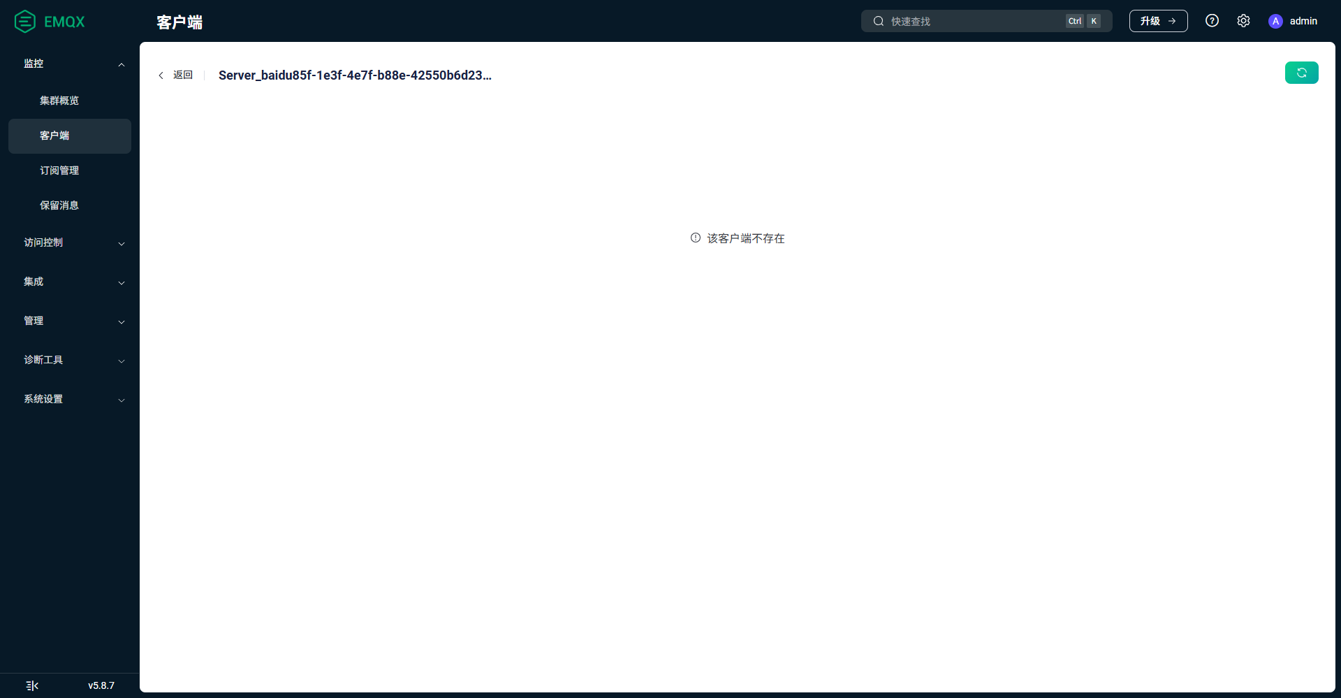 客户端列表页 找不到该会话。刷新之前打开的客户端详情页,提示“该客户端不存在”。
