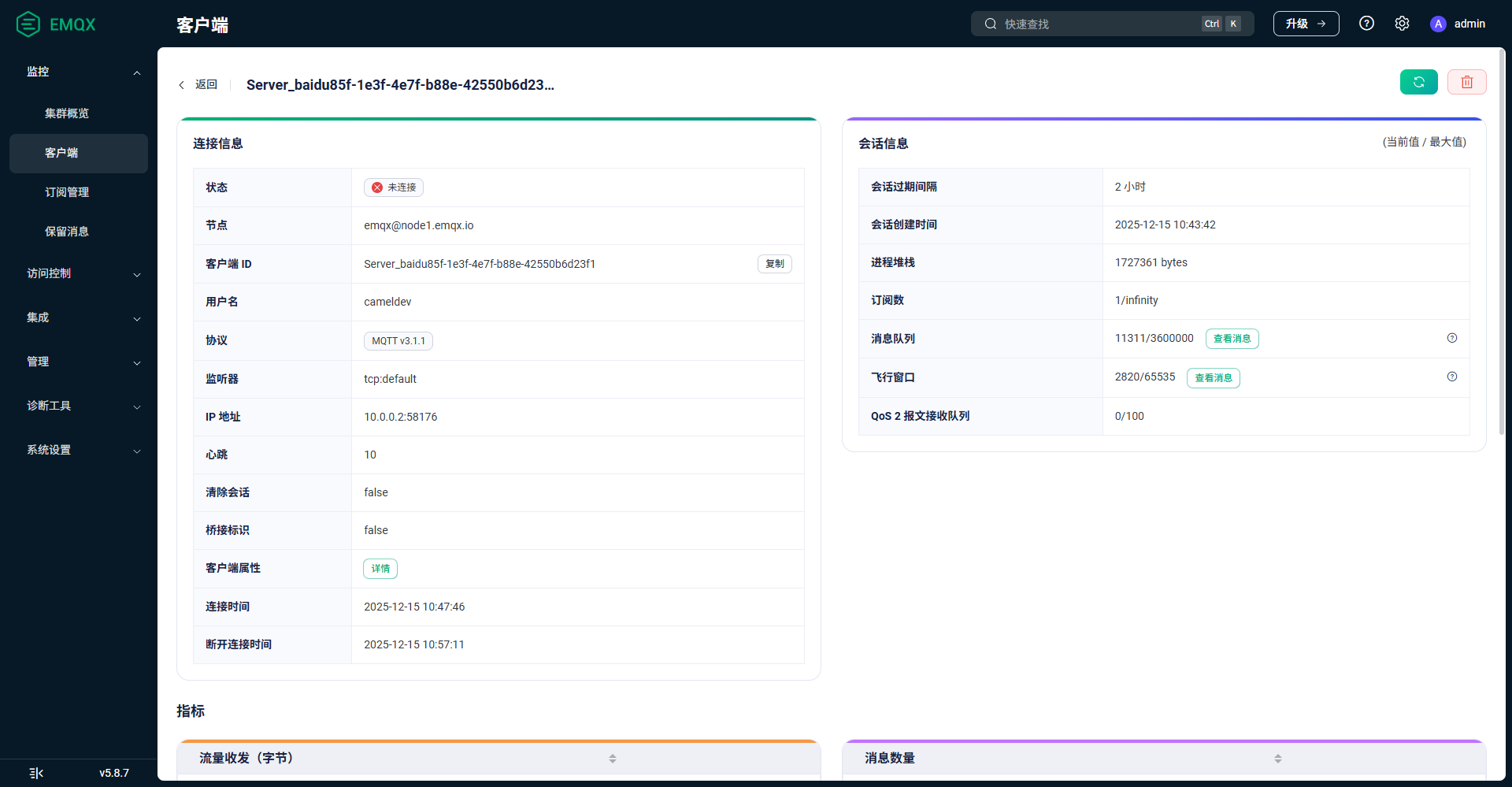 没有做任何操作,感觉是mqtt服务删除了该会话,表象是:客户端列表页 找不到该未连接会话。刷新之前打开的客户端详情页,提示“该客户端不存在”。