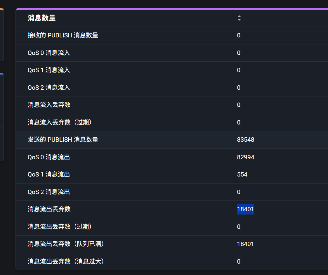 2025-12-29T17:03:15.848867+08:00 [warning] msg: dropped_msg_due_to_mqueue_is_full, mfa: emqx_session:handle_dropped/3, line: 644, peername: 172.10.1.7:36969, clientid: mqtt2kafka-client-4410945490694820, topic: dev/monitor/301323120124, payload: #{extra => ,flags => #{dup => false,retain => false},from => <<“301323120124-0ed5d6e6”>>,headers => #{peerhost => {172,10,1,7},properties => #{},proto_ver => 4,protocol => mqtt,redispatch_to => {<<“mqtt2kafka”>>,<<“dev/monitor/#”>>},username => <<“xxxxxx”>>},id => <<0,6,71,19,119,140,35,71,67,98,113,0,26,27,18,35>>,qos => 1,timestamp => 1766998795887,topic => <<“dev/monitor/301323120124”>>}, queue: #{dropped => 1502,len => 1000,max_len => 1000,store_qos0 => true}