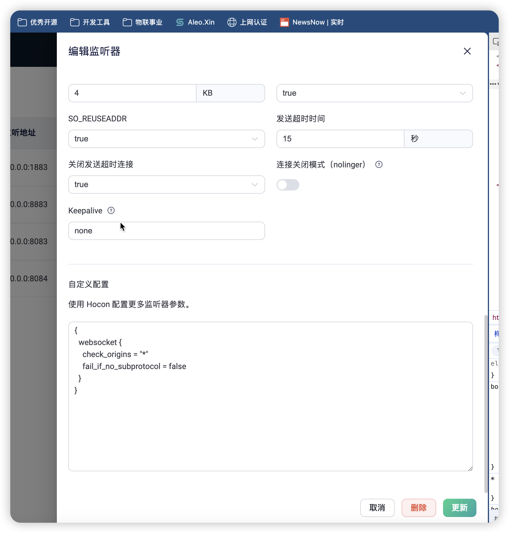 在 EMQX 中配置 ws 允许跨域:可以在dashboard 上监听器的高级选项中配置: