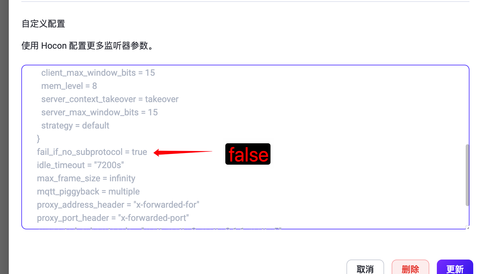 https://docs.emqx.com/zh/enterprise/v6.1.0/hocon/#V-listeners-S-listeners-ws-S-mqtt_ws_listener-websocket-S-ws_opts-fail_if_no_subprotocol