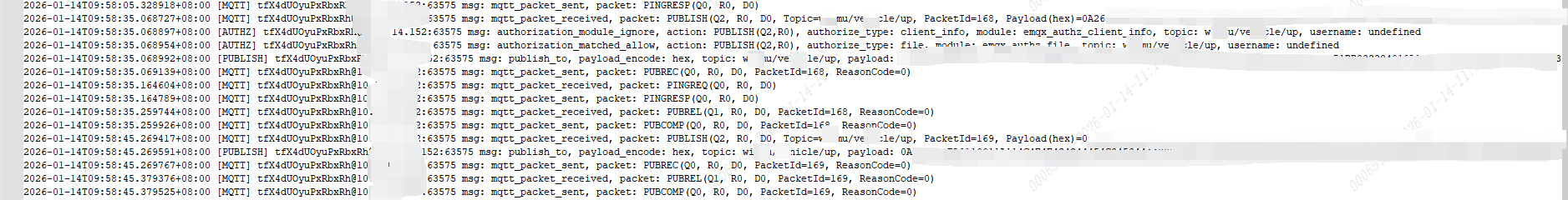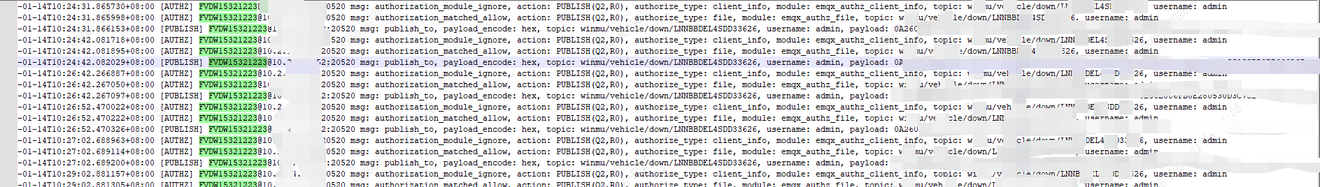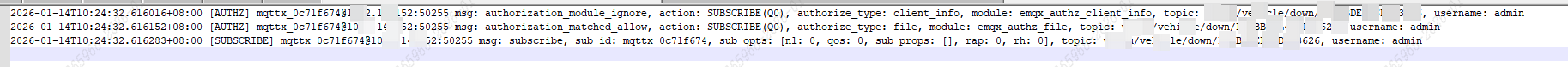 现象场景:车端发送登录报文到emq的up/车辆vin的topic,平台收到登录报文后处理完成后发送消息到down/车辆vin的topic,车端订阅到down的topic。目前很少部分车辆订阅了topic后无法消费到消息,能确认平台已经推送了消息到down的topic,在emq上做了日志追踪,根据客户端id和topic,做了日志追踪。相关信息截图如下