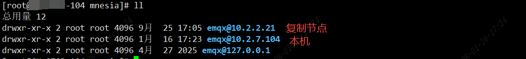 我复盘了下我这边的emq集群的配置,我们的集群6台机器,前面4台是先搭建的集群,后面两台是后加入的集群,目前我发现,后面加入集群的机器,是从前面4台的其中一台scp emq的整个安装目录之后修改配置文件后启动的,所以在data下面的mnesia目录下有两个节点的信息,想问下这种情况是否会出现上述这种偶发后加入节点的机器收不到消息的情况?