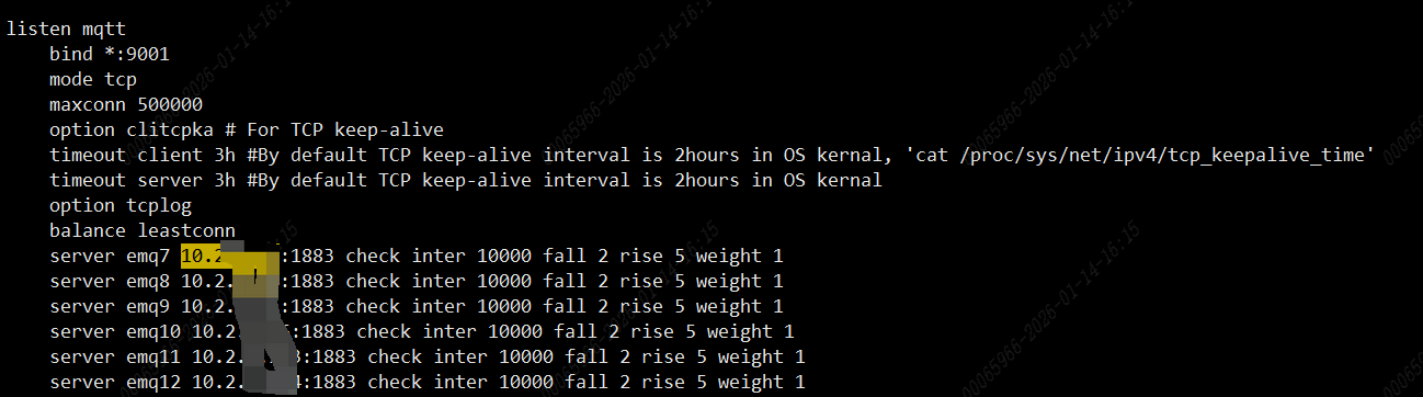 我这边复现了这个问题,我的haproxy是9001端口,和后端的6台emq建链使用最小连接数的算法,后面6台emq的权重一致,我们有个别的几辆问题车,在平台发布消息到down/车vin的topic上,这个topic我用mqttx订阅,订阅haproxy的9001端口和订阅后端新扩容的2台机器(103和104),共计3个订阅,会出现几种可能,
