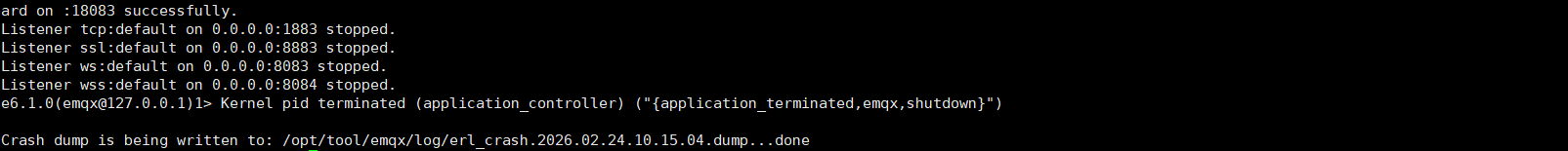 Crash dump is being written to: /opt/tool/emqx/log/erl_crash.2026.02.26.14.04.42.dump…done