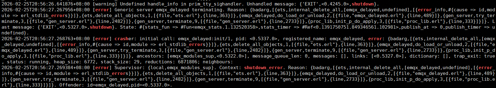 2026-02-26T14:05:51.374420+08:00 [error] crasher: initial call: emqx_delayed:init/1, pid: <0.5331.0>, registered_name: emqx_delayed, error: {badarg,[{ets,internal_delete_all,[emqx_delayed,undefined],[{error_info,#{cause => id,module => erl_stdlib_errors}}]},{ets,delete_all_objects,1,[{file,“ets.erl”},{line,363}]},{emqx_delayed,do_load_or_unload,2,[{file,“emqx_delayed.erl”},{line,489}]},{gen_server,try_terminate,3,[{file,“gen_server.erl”},{line,2482}]},{gen_server,terminate,9,[{file,“gen_server.erl”},{line,2733}]},{proc_lib,init_p_do_apply,3,[{file,“proc_lib.erl”},{line,333}]}]}, ancestors: [emqx_modules_sup,<0.5317.0>], message_queue_len: 0, messages: , links: [<0.5322.0>], dictionary: , trap_exit: true, status: running, heap_size: 6772, stack_size: 29, reductions: 11499; neighbours: