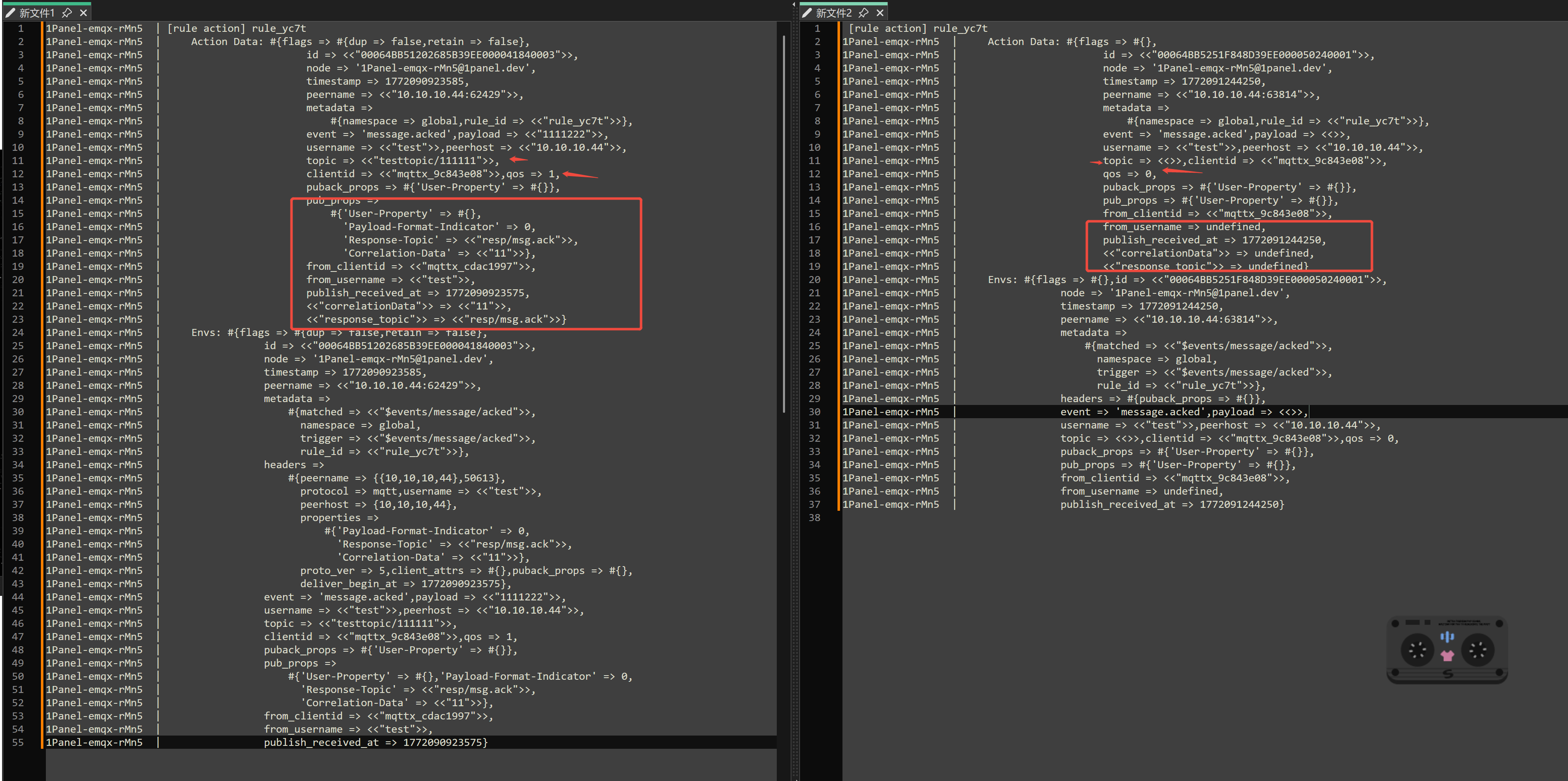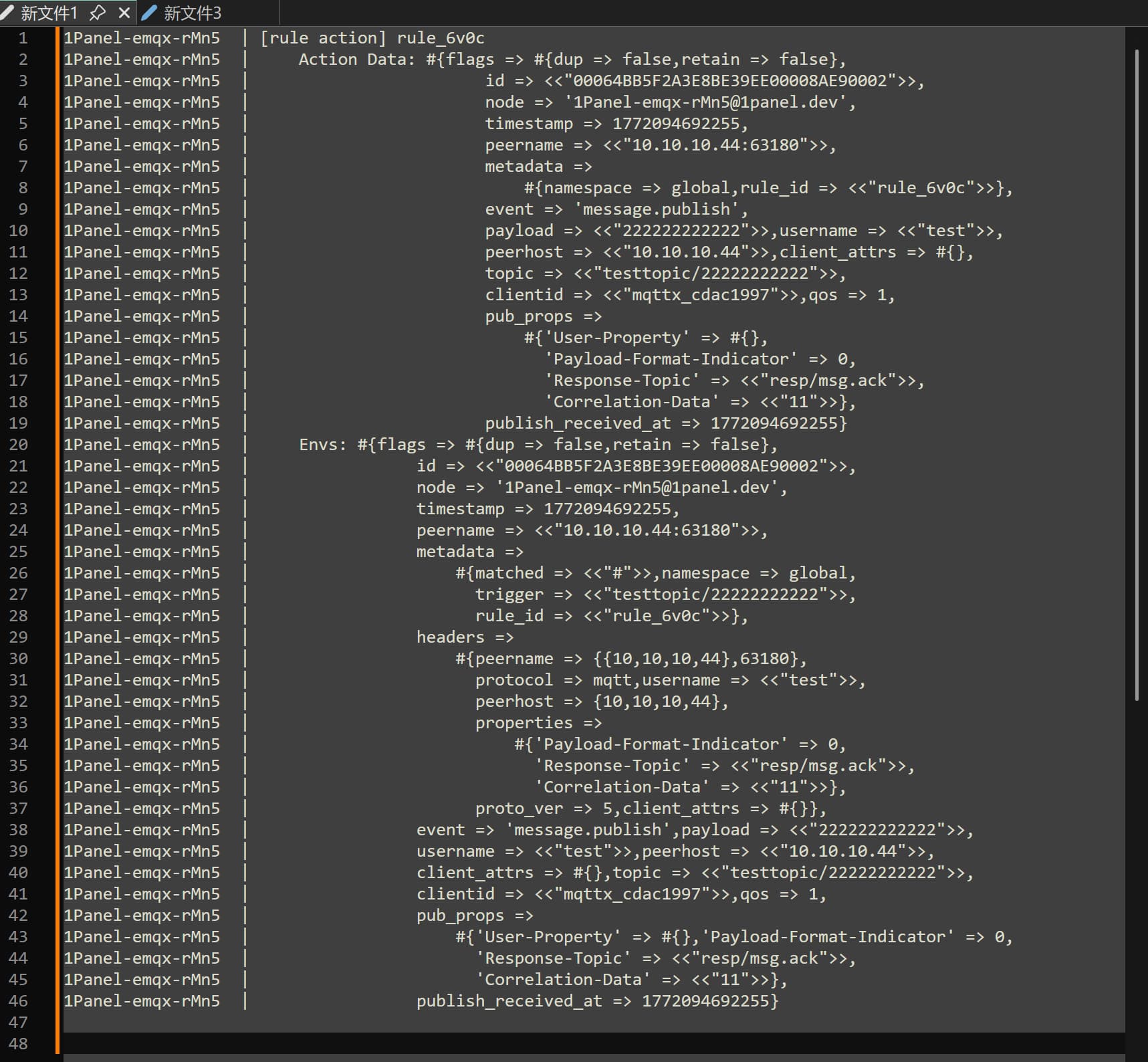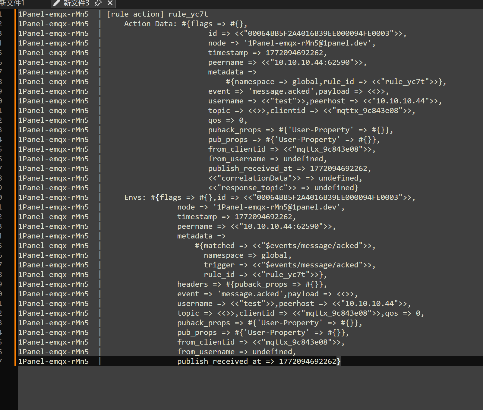 2026-02-26T10:18:24.544652+00:00 [debug] tag: RULE_SQL_EXEC, clientid: Gateway_007, msg: rule_activated, mfa: emqx_rule_runtime:trace_rule_sql/3(991), peername: 172.100.239.1:16565, username: Gateway_007, pid: <0.84303.0>, input: #{flags => #{dup => false,retain => false},id => <<"00064BB770D7901AF4450001494F0003">>,node => 'emqx@127.0.0.1',timestamp => 1772101104544,peername => <<"172.100.239.1:16565">>,metadata => #{namespace => global,rule_id => <<"rule_gmzw">>},event => 'message.delivered',payload => <<"{\n \"test\": 2\n}">>,username => <<"Gateway_007">>,peerhost => <<"172.100.239.1">>,topic => <<"test/1/100">>,qos => 1,clientid => <<"Gateway_007">>,pub_props => #{'User-Property' => #{<<"11">> => <<"22">>},'User-Property-Pairs' => [#{value => <<"22">>,key => <<"11">>}],'Payload-Format-Indicator' => 1,'Response-Topic' => <<"ddd">>,'Correlation-Data' => <<"fff">>},from_clientid => <<"Gateway_007">>,from_username => <<"Gateway_007">>,publish_received_at => 1772101104537}, environment: #{metadata => #{matched => <<"$events/message/delivered">>,trigger => <<"$events/message/delivered">>},headers => #{peername => {{172,100,239,1},16565},protocol => mqtt,username => <<"Gateway_007">>,peerhost => {172,100,239,1},properties => #{'User-Property' => [{<<"11">>,<<"22">>}],'Payload-Format-Indicator' => 1,'Response-Topic' => <<"ddd">>,'Correlation-Data' => <<"fff">>},proto_ver => 5,client_attrs => #{}}}