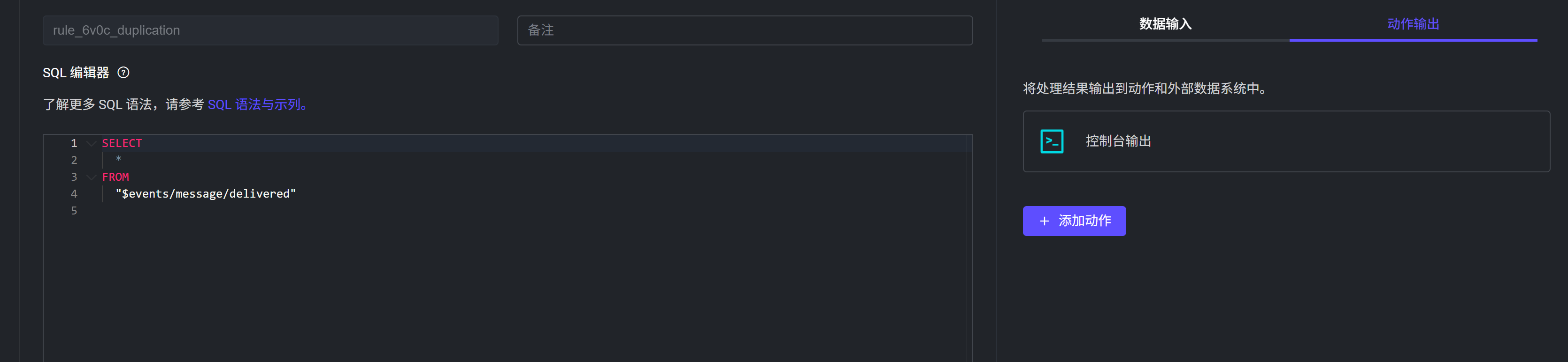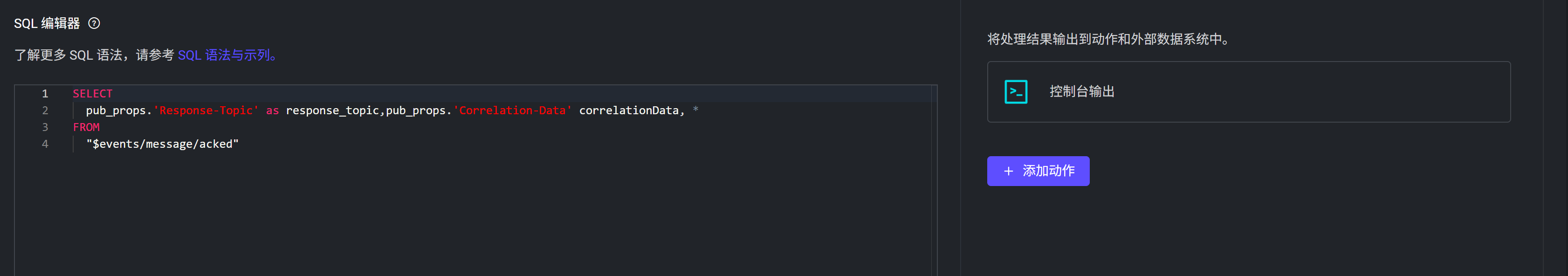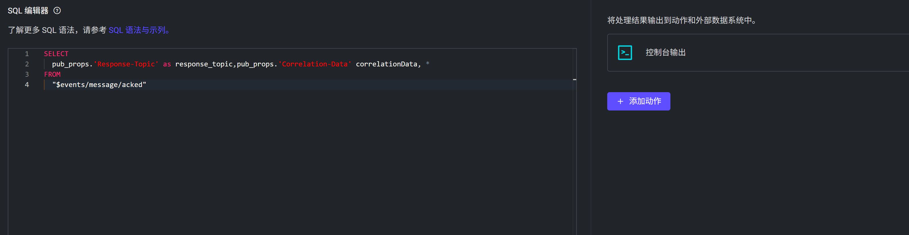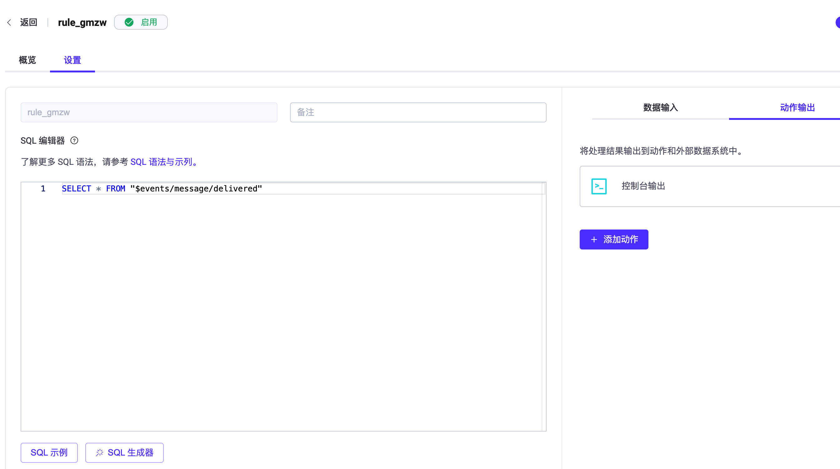2026-02-26T10:17:24.255345+00:00 [debug] tag: ACTION, msg: action_success, mfa: emqx_rule_runtime:trace_action_bridge/5(975), pid: <0.84303.0>, result: ok, namespace: global, rule_id: <<"rule_gmzw">>, action_info: #{mod => emqx_rule_actions,func => console}