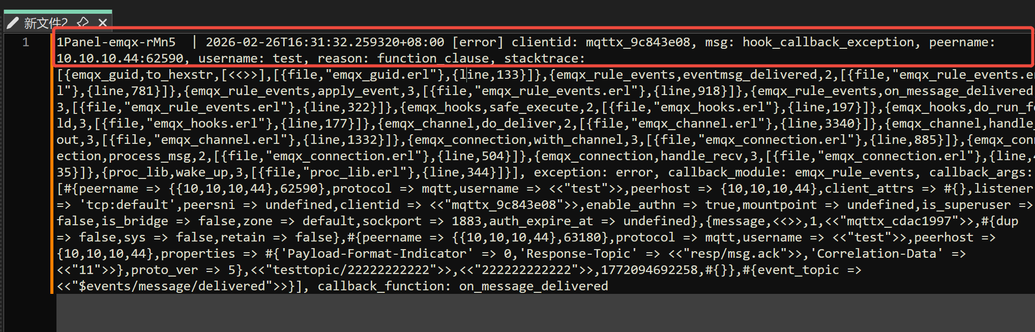 2026-02-26T10:18:24.537733+00:00 [debug] tag: PUBLISH, clientid: Gateway_007, msg: publish_to, mfa: emqx_trace:publish/1(127), peername: 172.100.239.1:16565, username: Gateway_007, topic: test/1/100, pid: <0.84303.0>, payload: {, "test": 2, }, payload_encode: text