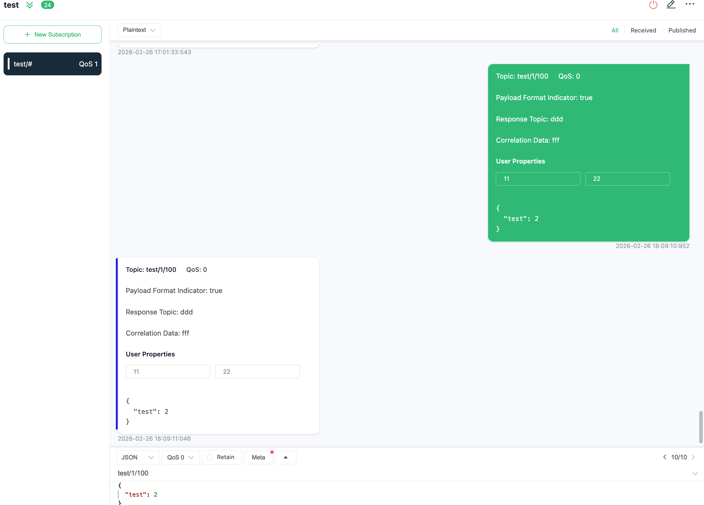 2026-02-26T10:17:24.255438+00:00 [debug] tag: MQTT, clientid: Gateway_007, msg: mqtt_packet_sent, mfa: emqx_connection:serialize_and_inc_stats/2(973), peername: 172.100.239.1:16565, username: Gateway_007, pid: <0.84303.0>, packet: PUBLISH(Q0, R0, D0, Topic=test/1/100, PacketId=undefined, Payload(text)={, "test": 2, }), payload_encode: text