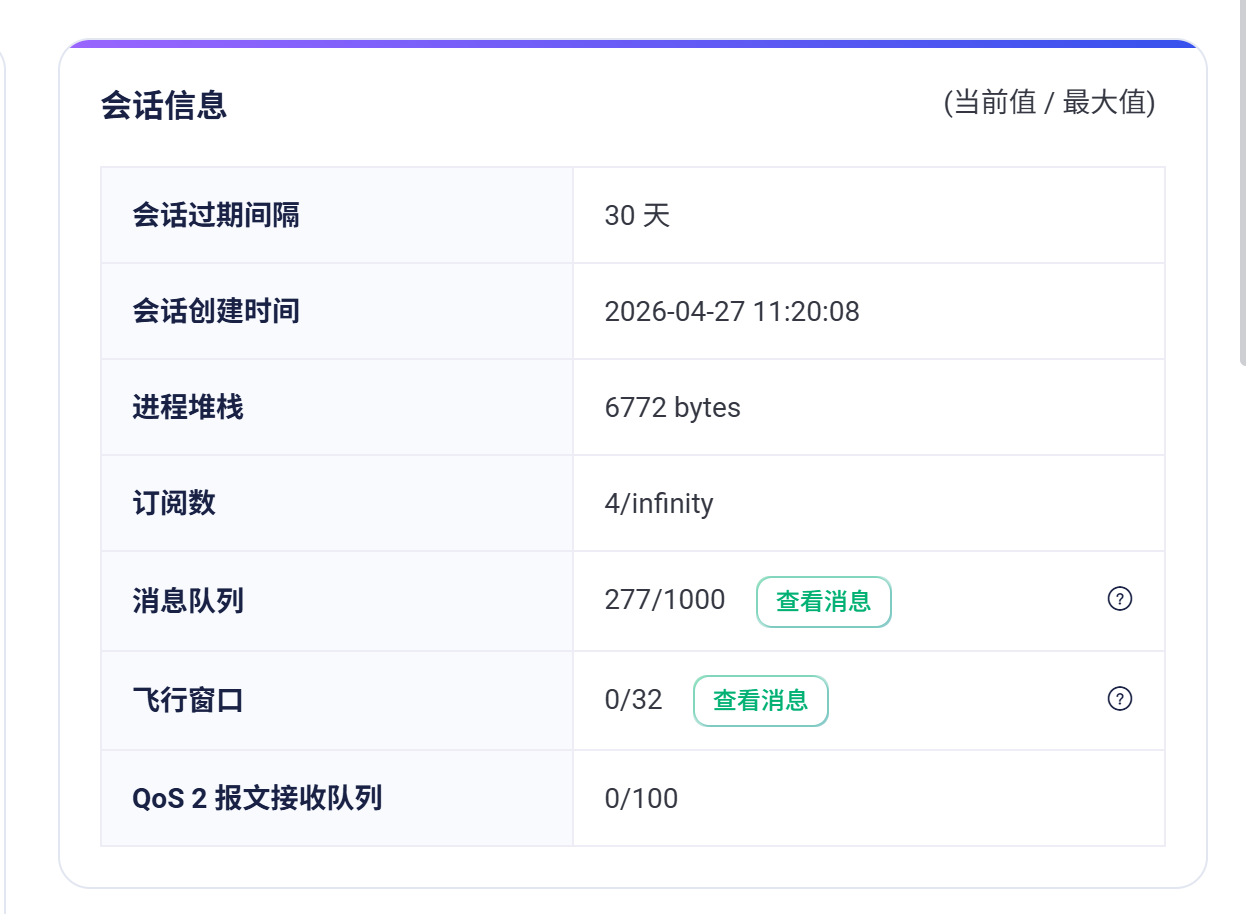 补一条容易混淆的:即使开了持久会话,在线连接期间依然会有运行时内存(进程邮箱、inflight 窗口等),只是“离线积压消息”的主存储从内存队列变成了持久存储。