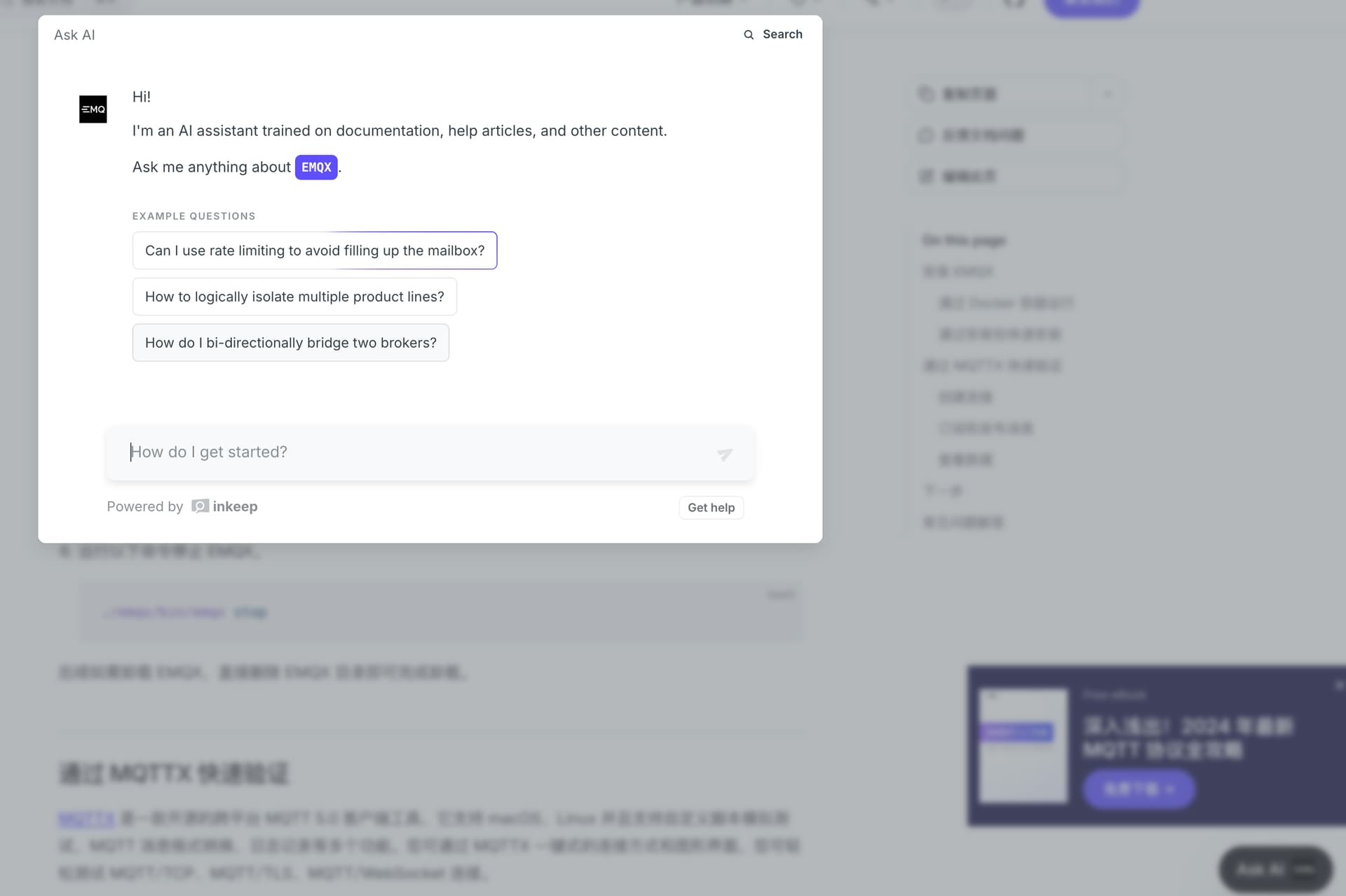 - 智能问答 :能够回答关于EMQX安装、配置、使用、故障排查等方面的问题
